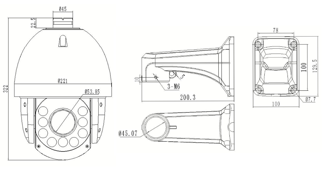Peb PTZ Koob Yees Duab Hnyav 6 kg, nrog qhov ntev ntawm φ221mm × 322mm, tsim kom yooj yim installation.